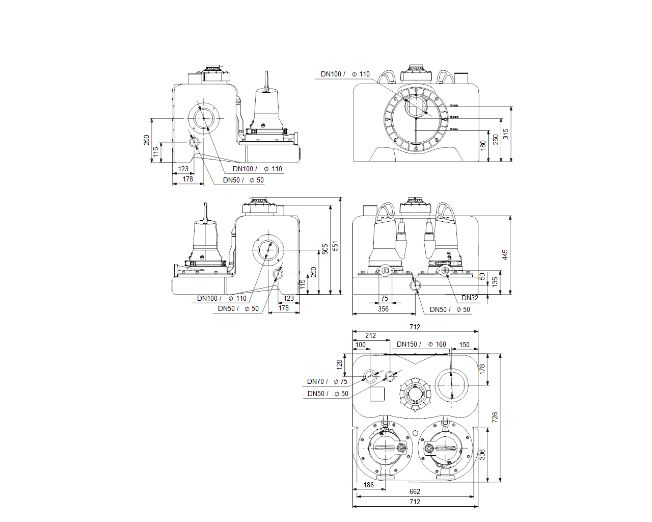 Сборный резервуар содержит 7 входных патрубков попериметру. Выходной патрубок DN100 позволяет подключить трубопроводы от180 идо315 ммбез переходников. DN100 иDN50 входы накаждой стороне. DN150, DN50 вход наверхней части резервуара.