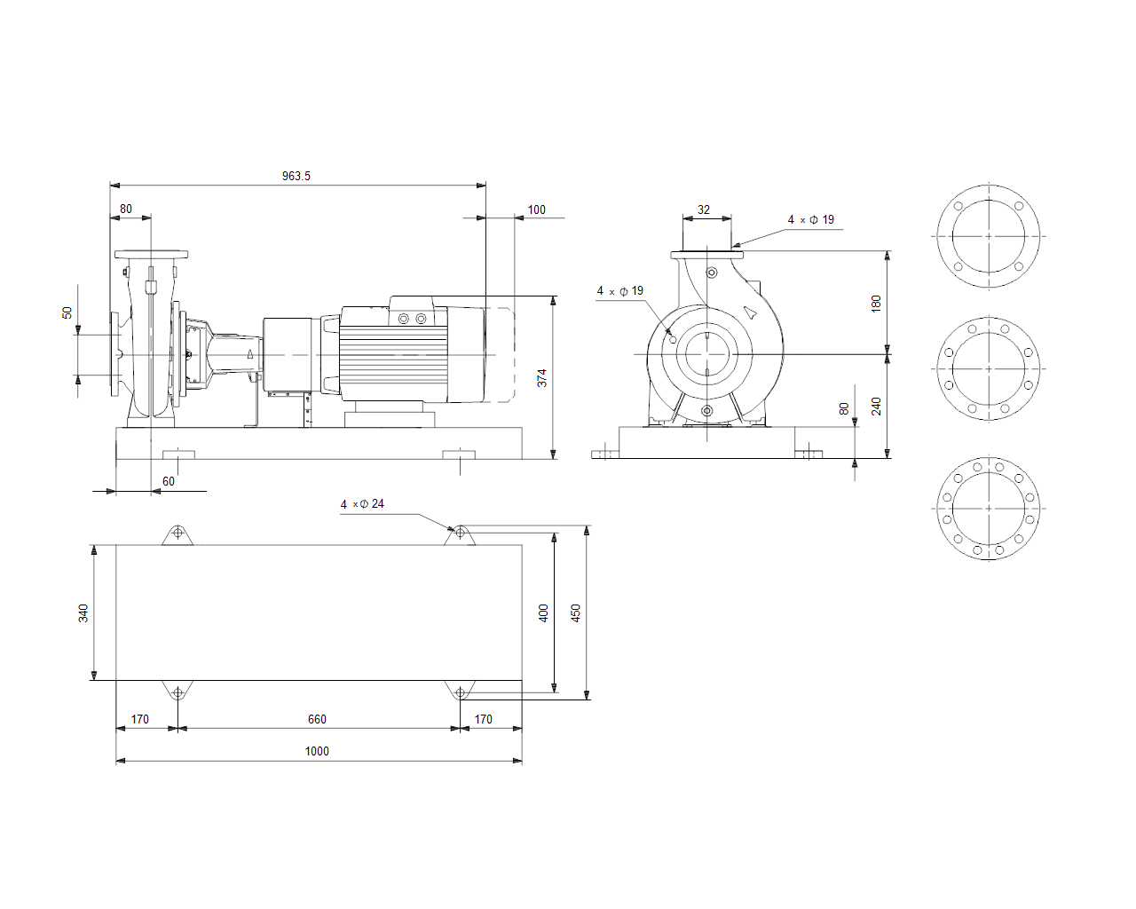 Несамовсасывающий, одноступенчатый, центробежный, насос соспиральной направляющей камерой разработан всоответствии сISO 5199, при этом его размер иноминальная мощность соответствуютEN 733. Фланцы— PN16 сразмерами всоответствии сEN 1092-2. Насос оборудован осевым всасывающим, радиальным выходным патрубками игоризонтальным валом. Онимеет конструкцию сразборной муфтой, что обеспечивает демонтаж муфты, кронштейна подшипника ирабочего колеса, недемонтируя электродвигатель, корпус насоса или трубную обвязку. Несбалансированное резиновое сильфонное уплотнение всоответствии сDINEN 12756. Насос оснащен асинхронным электродвигателем своздушным охлаждением, скреплением налапах. Насос иэлектродвигатель поставляются смонтированными наобщей плите-основании.