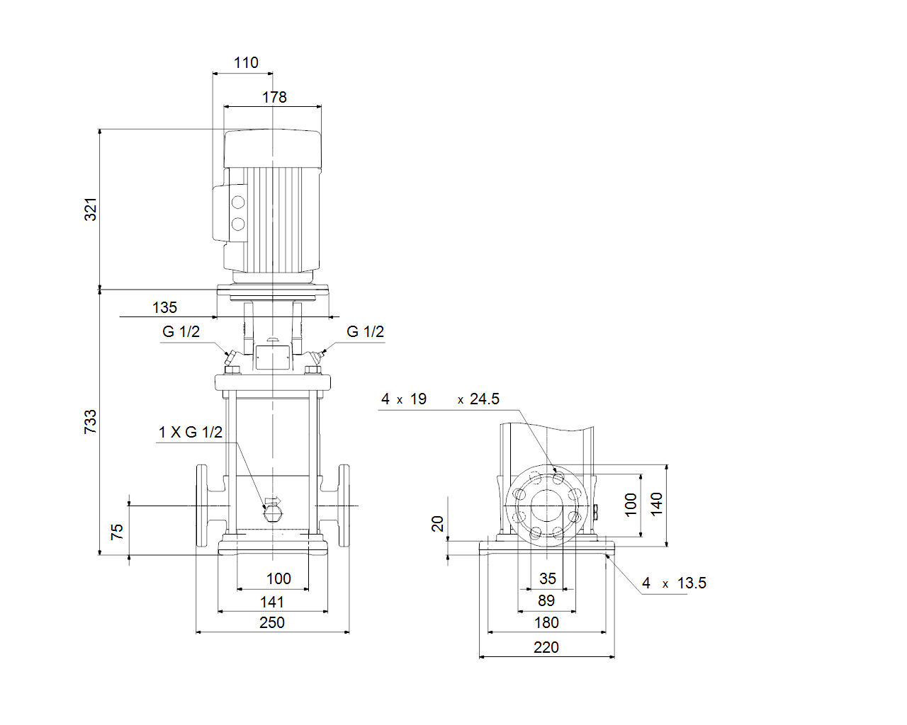 Вертикальный многоступенчатый центробежный насос свсасывающим инапорным патрубками, расположенными наодном уровне («ин-лайн»), что обеспечивает возможность установки вгоризонтальной однотрубной системе. Головная часть иоснование насоса изчугуна— все остальные контактирующие сперекачиваемой жидкостью детали изнержавеющей стали. Картриджное уплотнение вала обеспечивает высокую надежность, безопасное использование илегкий доступ для обслуживания. Вращение передается через разъемную муфту. Соединение трубопровода выполняется спомощью комбинированных фланцев стандартов DIN-ANSI-JIS. Насос оснащен асинхронным 3-фазным электродвигателем налапах, своздушным охлаждением.