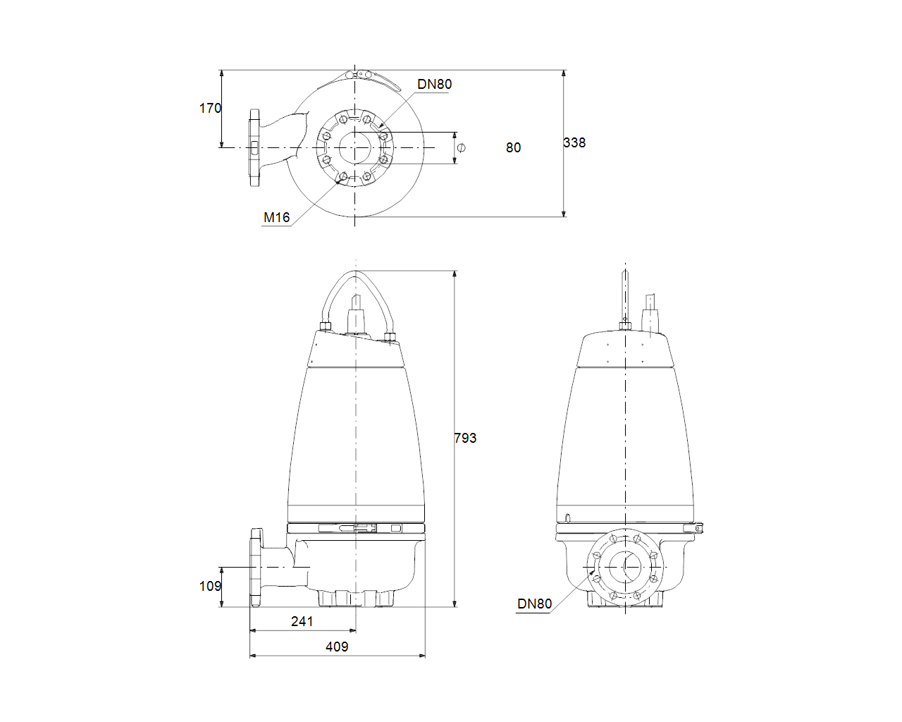 Несамовсасывающий одноступенчатый центробежный насос, предназначенный для перекачивания сточных вод, технологических вод инеочищенных сточных вод, непропущенных через решетку. Насос предназначен для периодической инепрерывной эксплуатации. Безжидкостная система охлаждения, нетребующая технического обслуживания, обеспечивает возможность использования насоса при установке впогруженном положении или «сухой» установке. Эффективное рабочее колесо SuperVortex обеспечивает проход длинных волокон итвердых частиц до80 ммиподходит для сточных вод ссодержанием сухих веществ до5%. Уникальная система монтажа спомощью хомута изнержавеющей стали позволяет быстро илегко выполнять демонтаж насоса сузла электродвигателя для технического обслуживания иосмотра. Нетребуются никакие специальные инструменты. Соединение трубопровода обеспечивается сиспользованием фланца DIN .